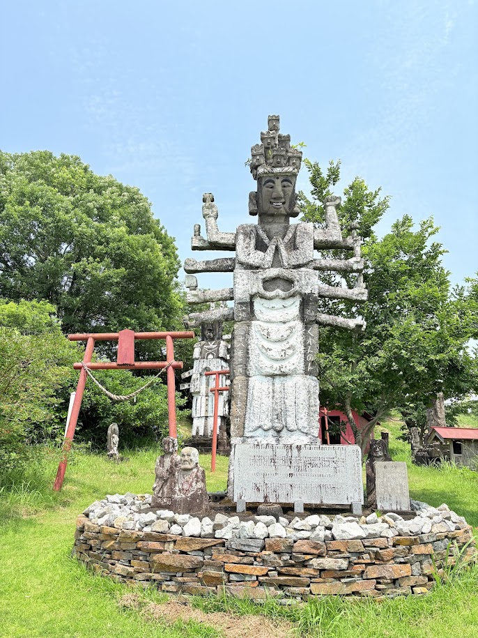 この場所は、町民であった岩岡保吉さんという方が作った大小様々な石像がずらーっと鎮座する不思議な空間。岩岡さんは私財を投じて、たった一人でひとつずつ手彫りで制作しました。なんと、生涯で700体以上もの石像を作ったと言われています。大きなものは全長7メートルを超えるほど壮大です。