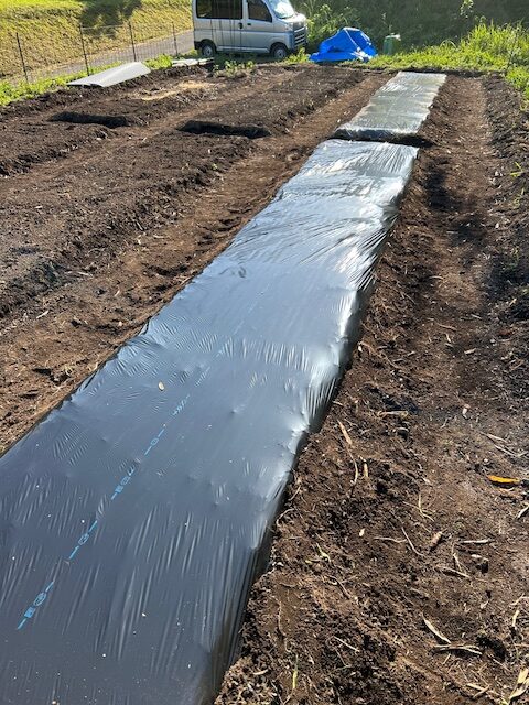 また、機械を使用せず手作業での初めてマルチ張り、防獣柵設置した後の様子をアップします。なかなか上手くできず、悪戦苦闘でした。