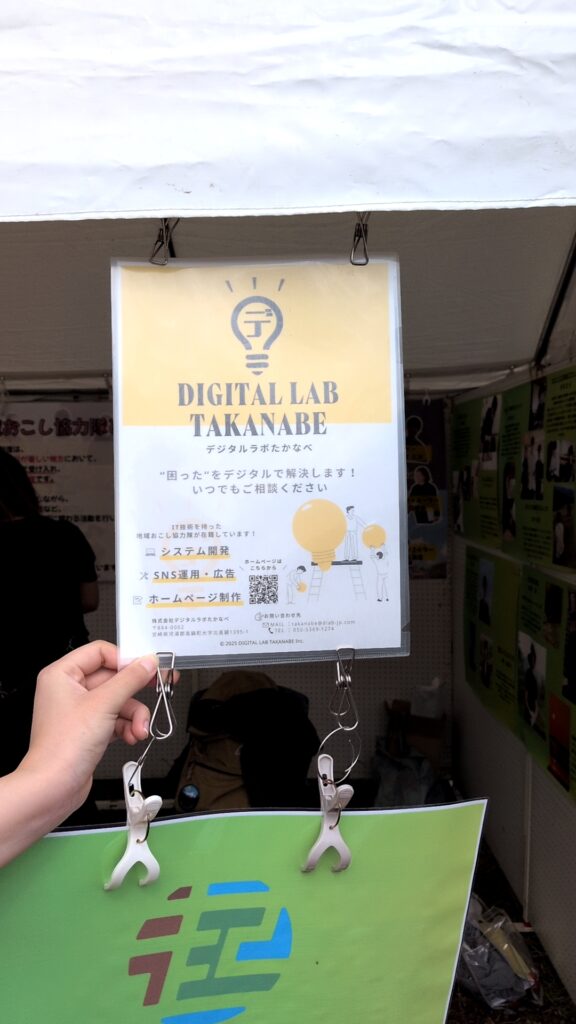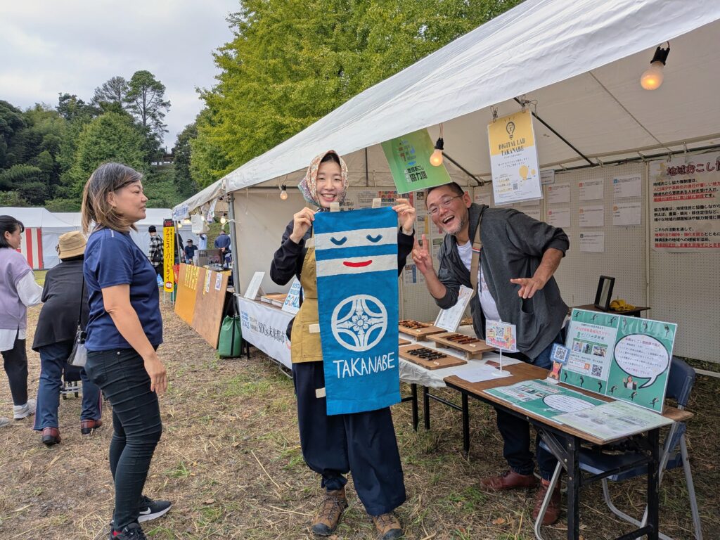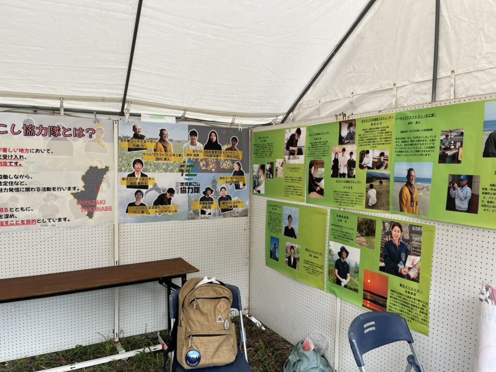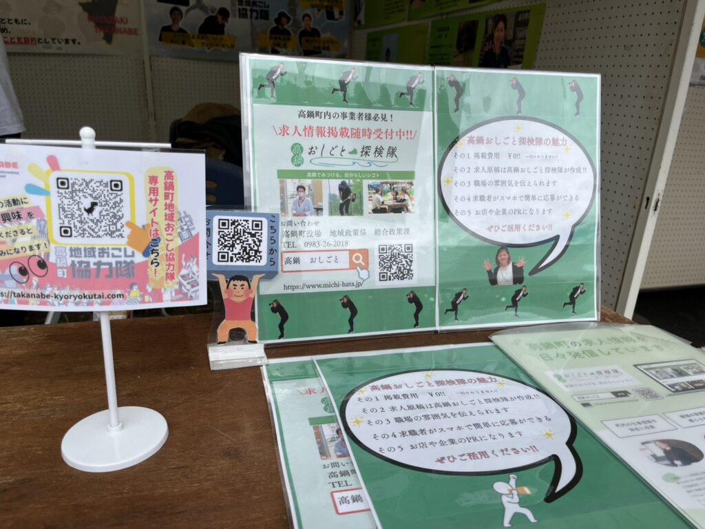ぶち木工西村さんの木工小物作品の販売をはじめ、DX支援会社「デジタルラボたかなべ」と求人サイト「高鍋おしごと探検隊」の紹介をさいとうよしみさんの協力隊のぼりを目印にアピールしてみました。地域おこし協力隊と来場者の方が交流したいと盛り上がりました。。。